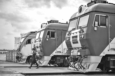 8月19日,一名中方铁路工程师从蒙内铁路机车前走过。 新华社记者 杨光摄
